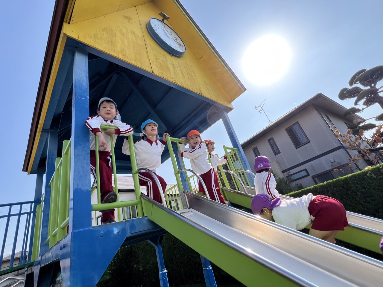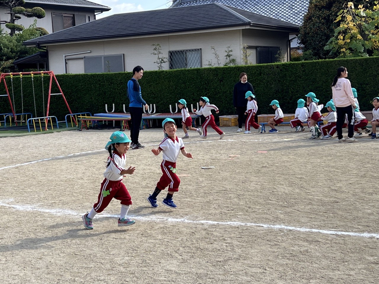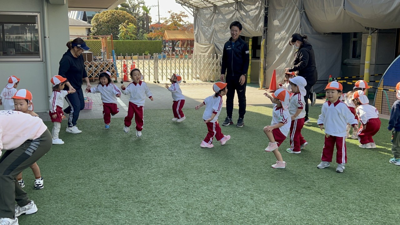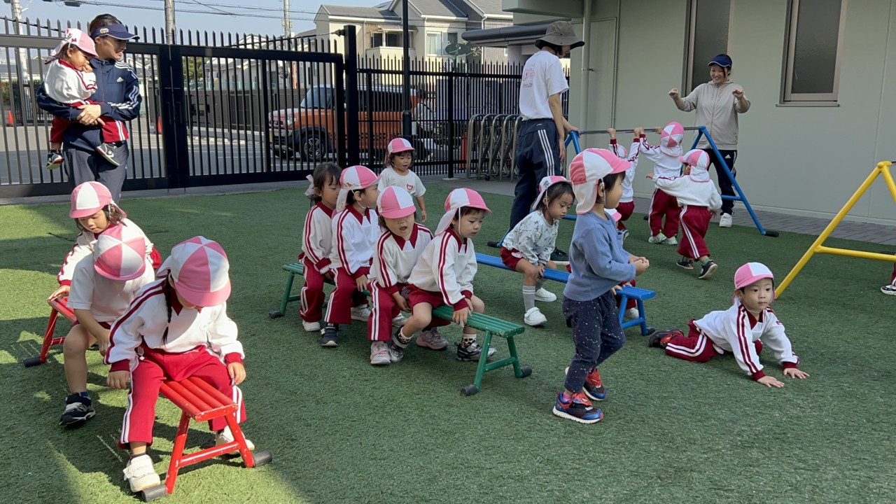 年中組さんは園庭で走ったり、運動遊びを楽しんでいました。