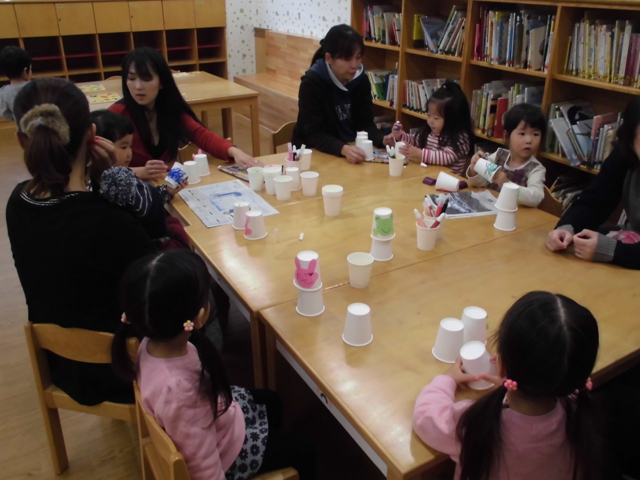 今日は、紙コップを使って動くおもちゃを作って遊びました。