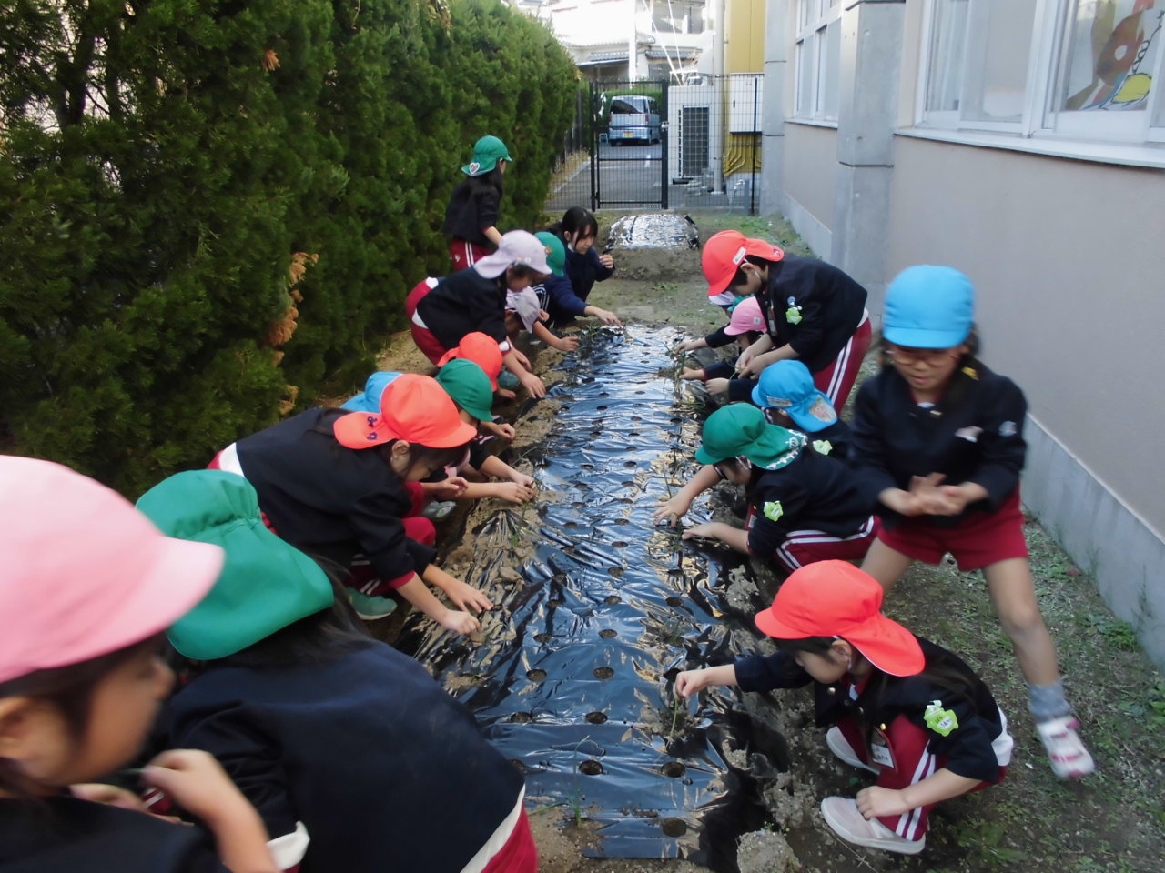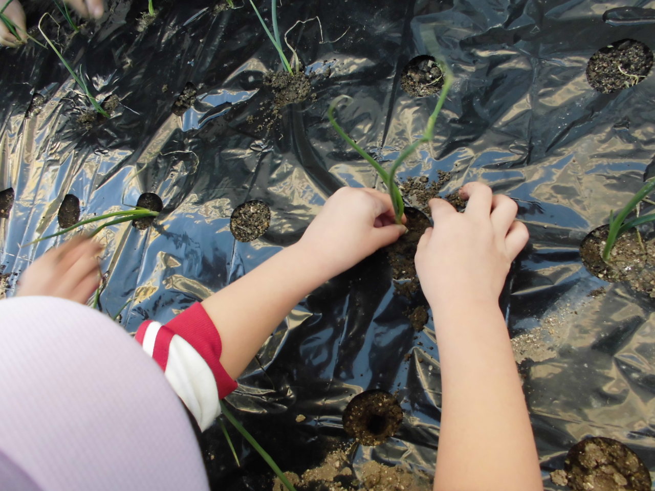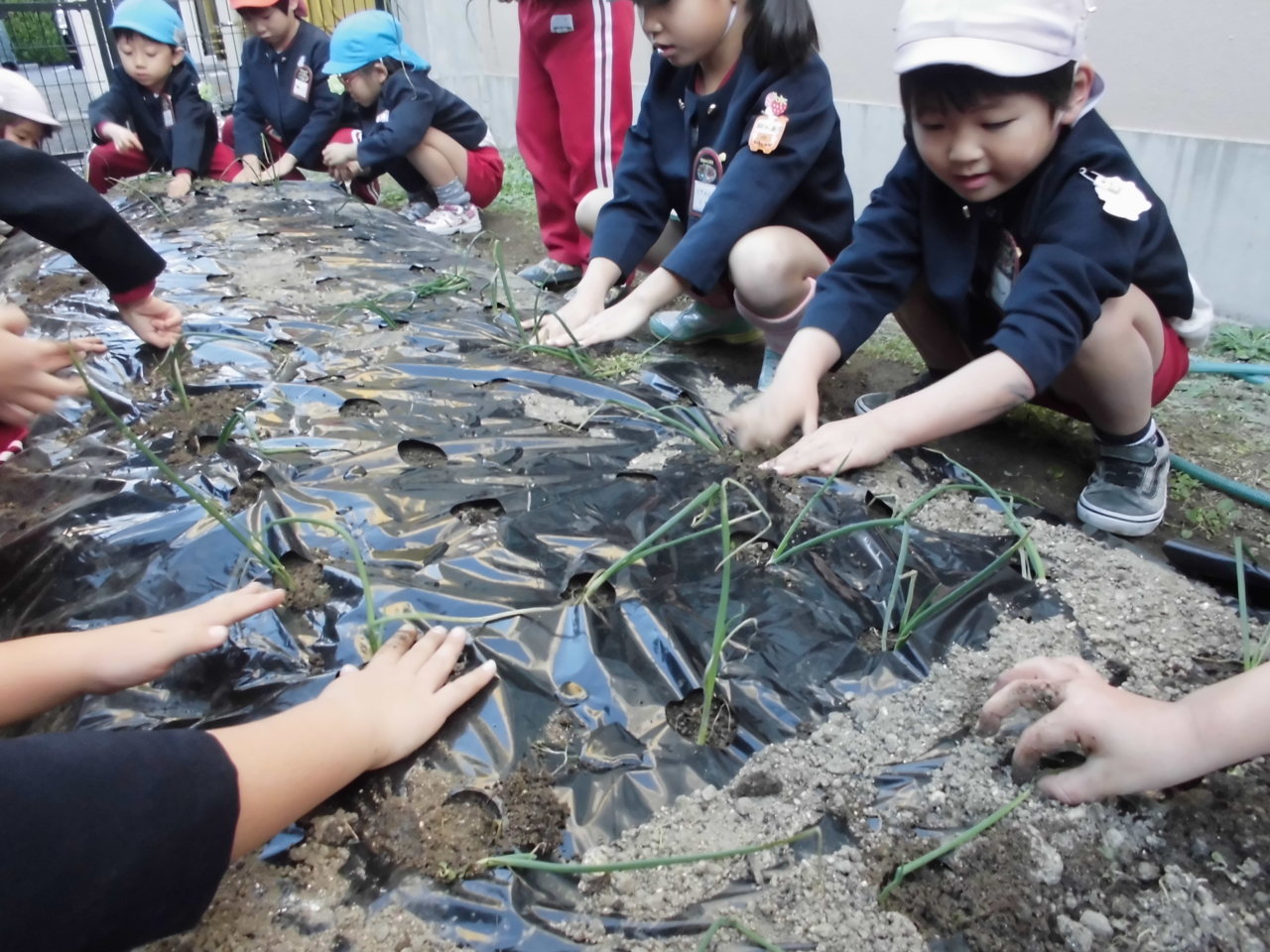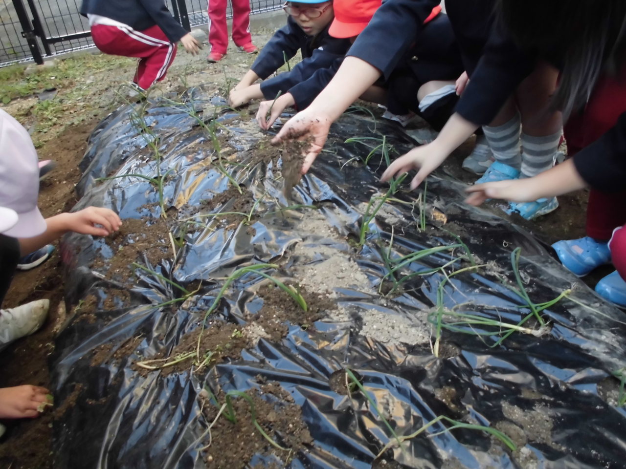 幼稚園の畑に玉ねぎの苗を植えました。