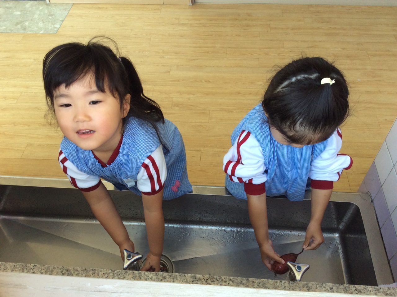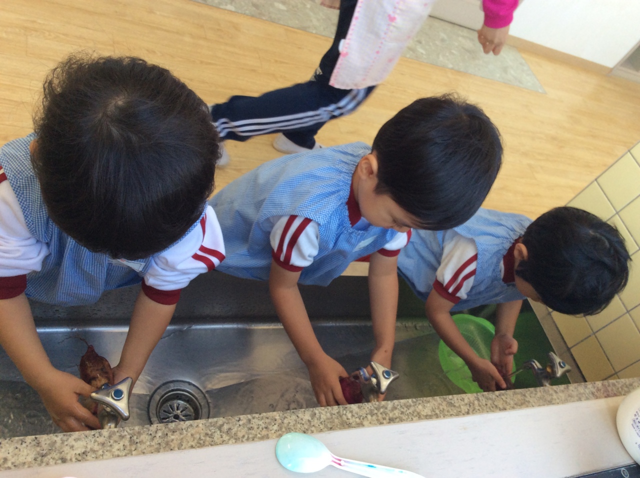 明日のポテトパーティの年少組の担当は、おいも洗い係です。