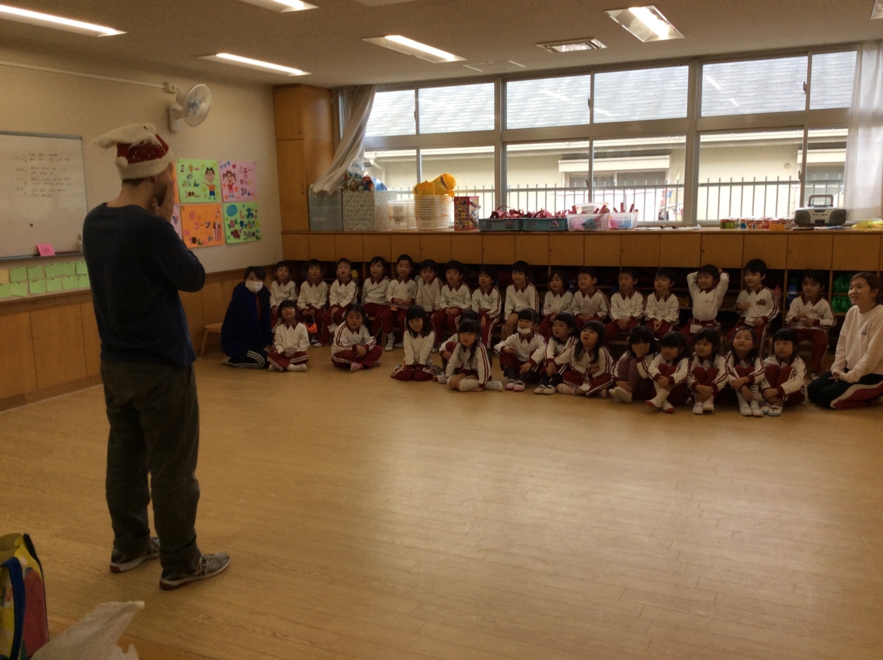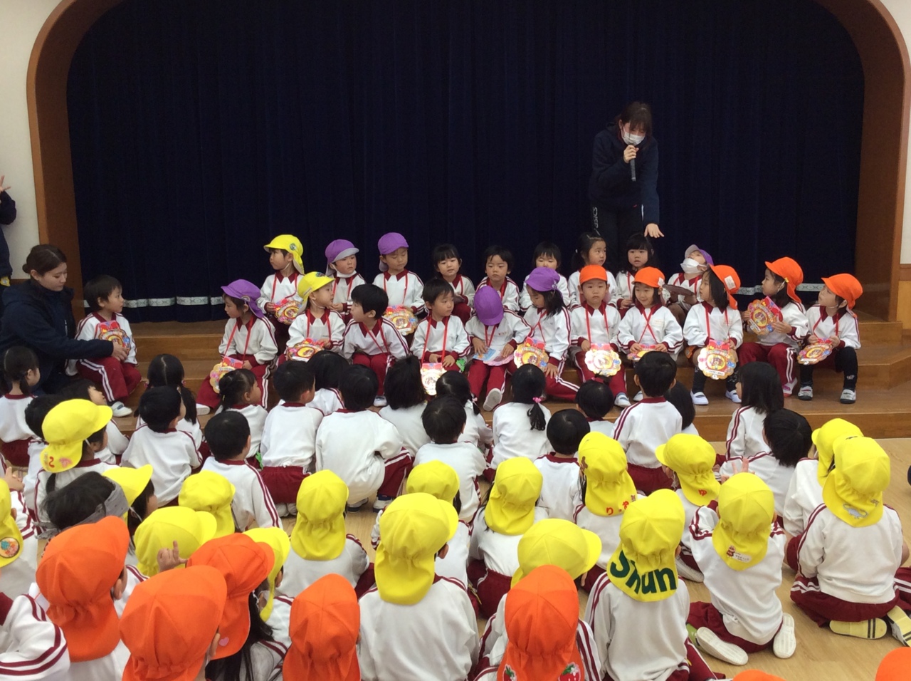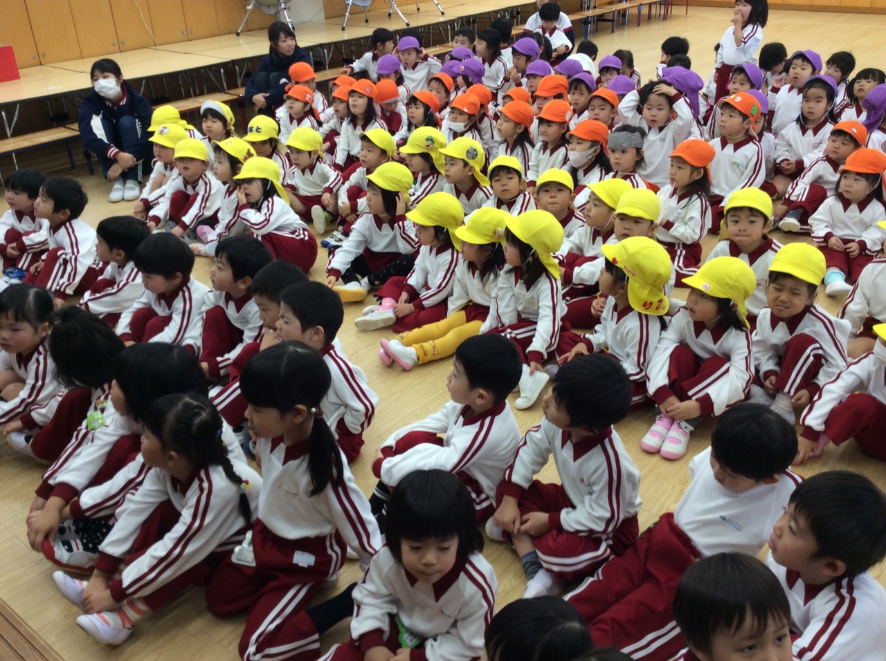 年少組の誕生日会は先生たちによる。手作り大型紙芝居「ぐりとぐら」でした。
