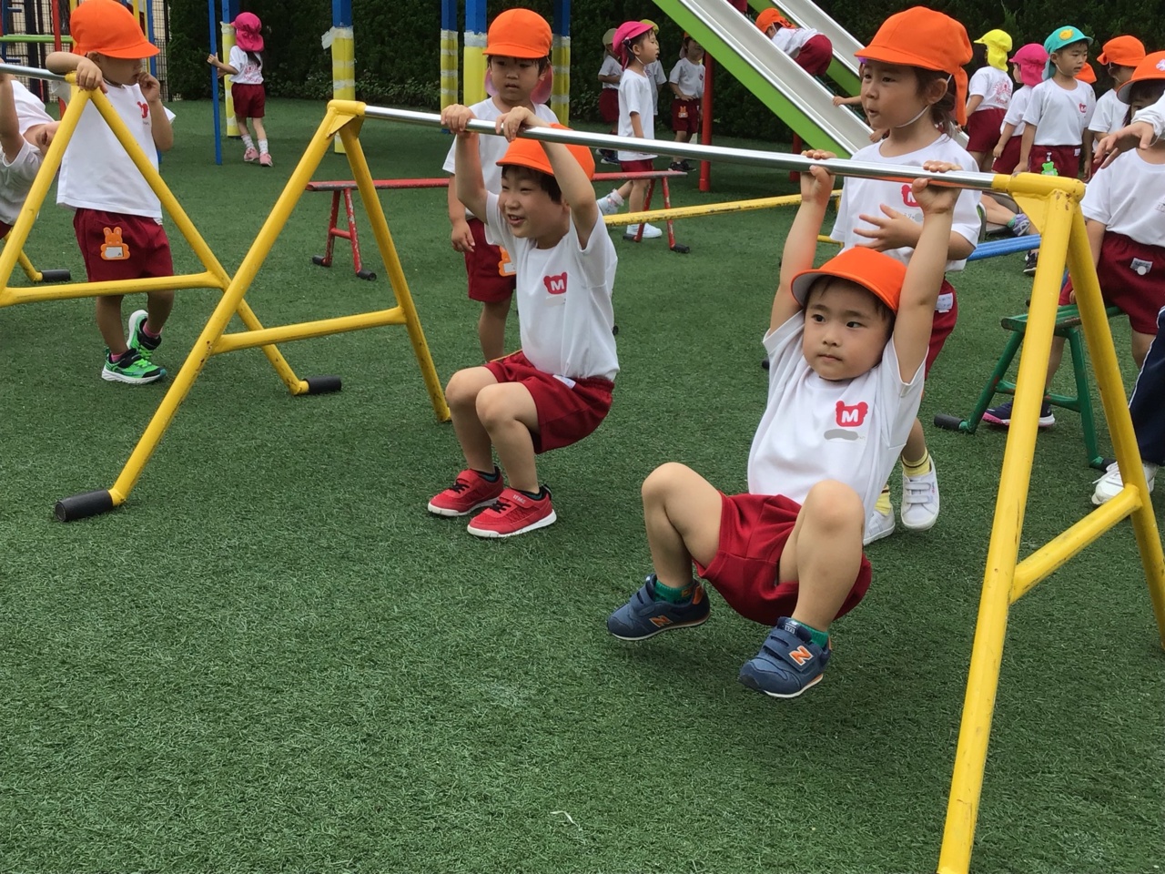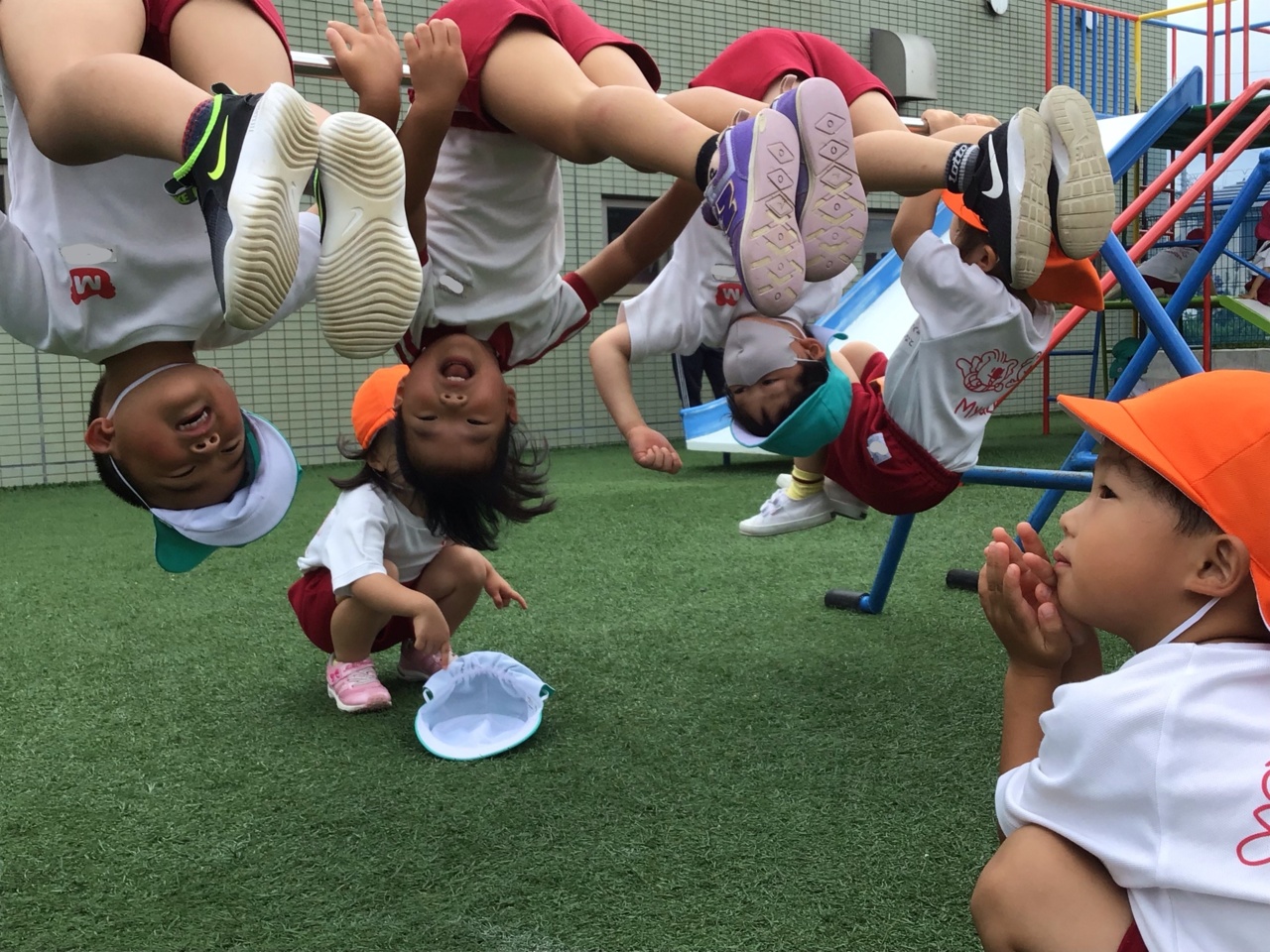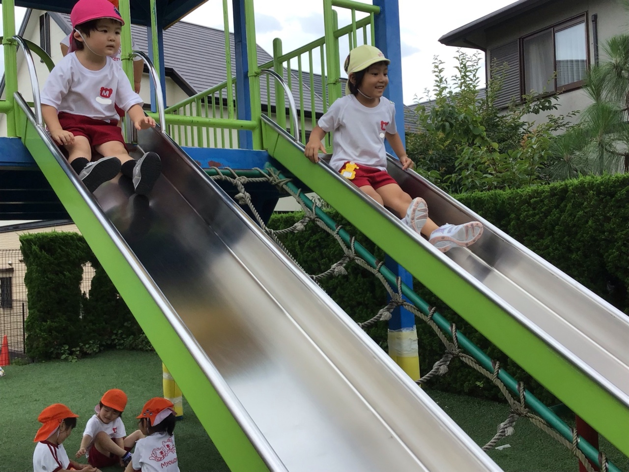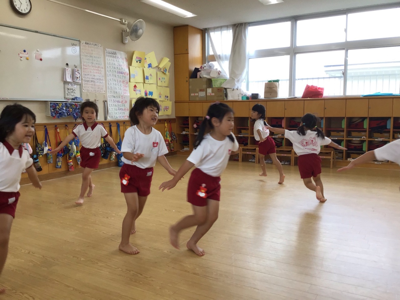 幼稚園では、晴れ間には園庭や屋上で遊んだり、リトミックやゲーム遊びで