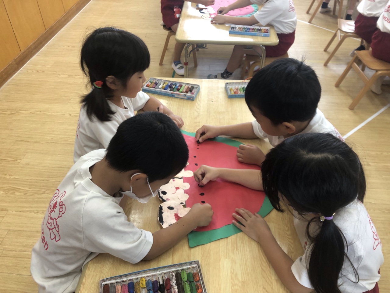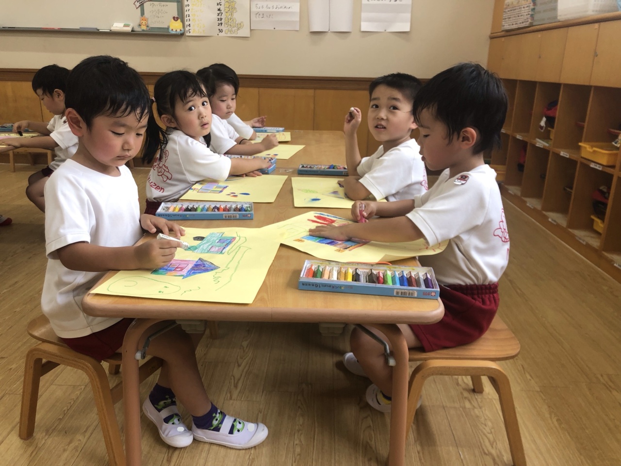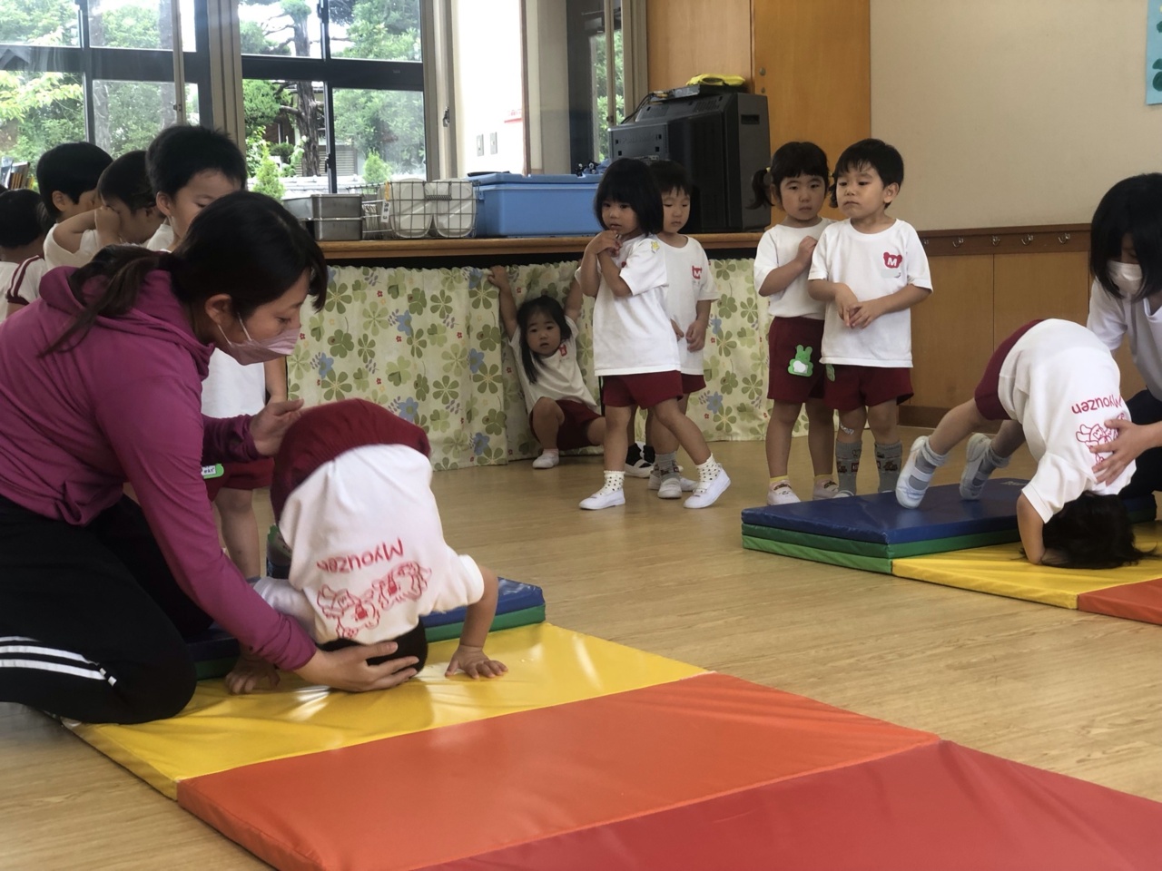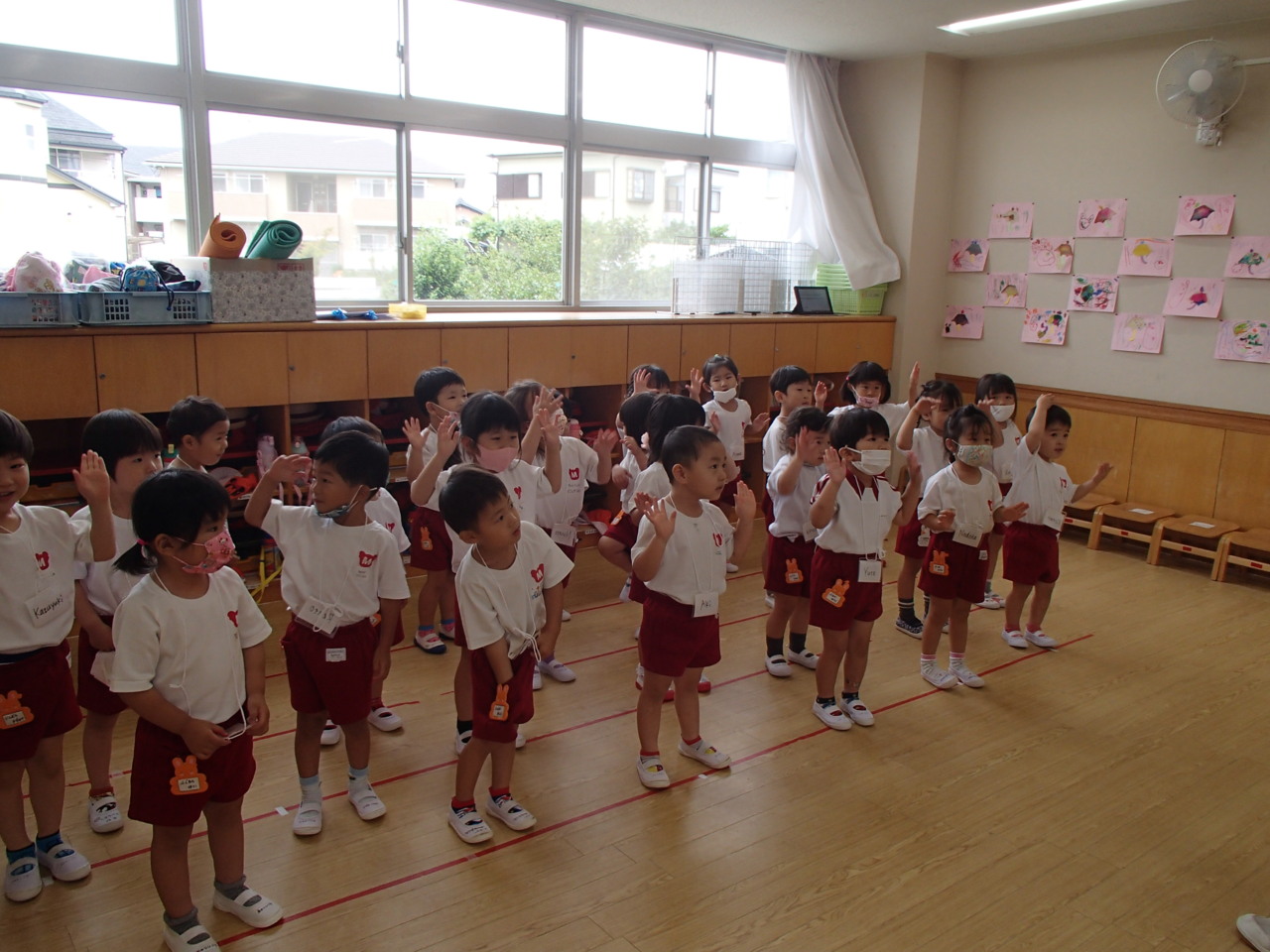 年長組さんは鼓隊パレードの練習をお遊戯室でしてました。