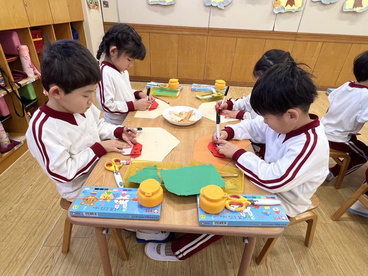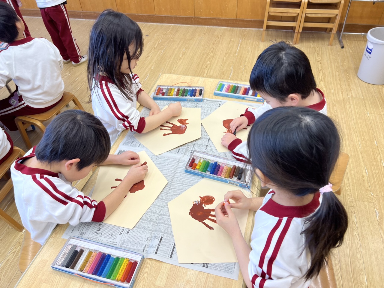 年長ぐみと年中組さんは絵馬を制作しています。