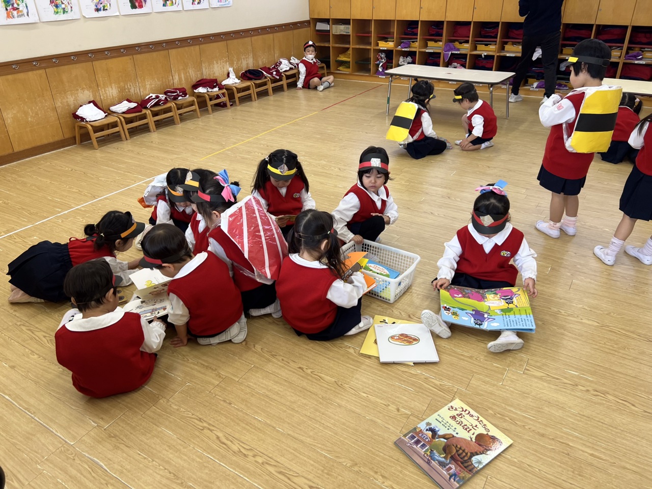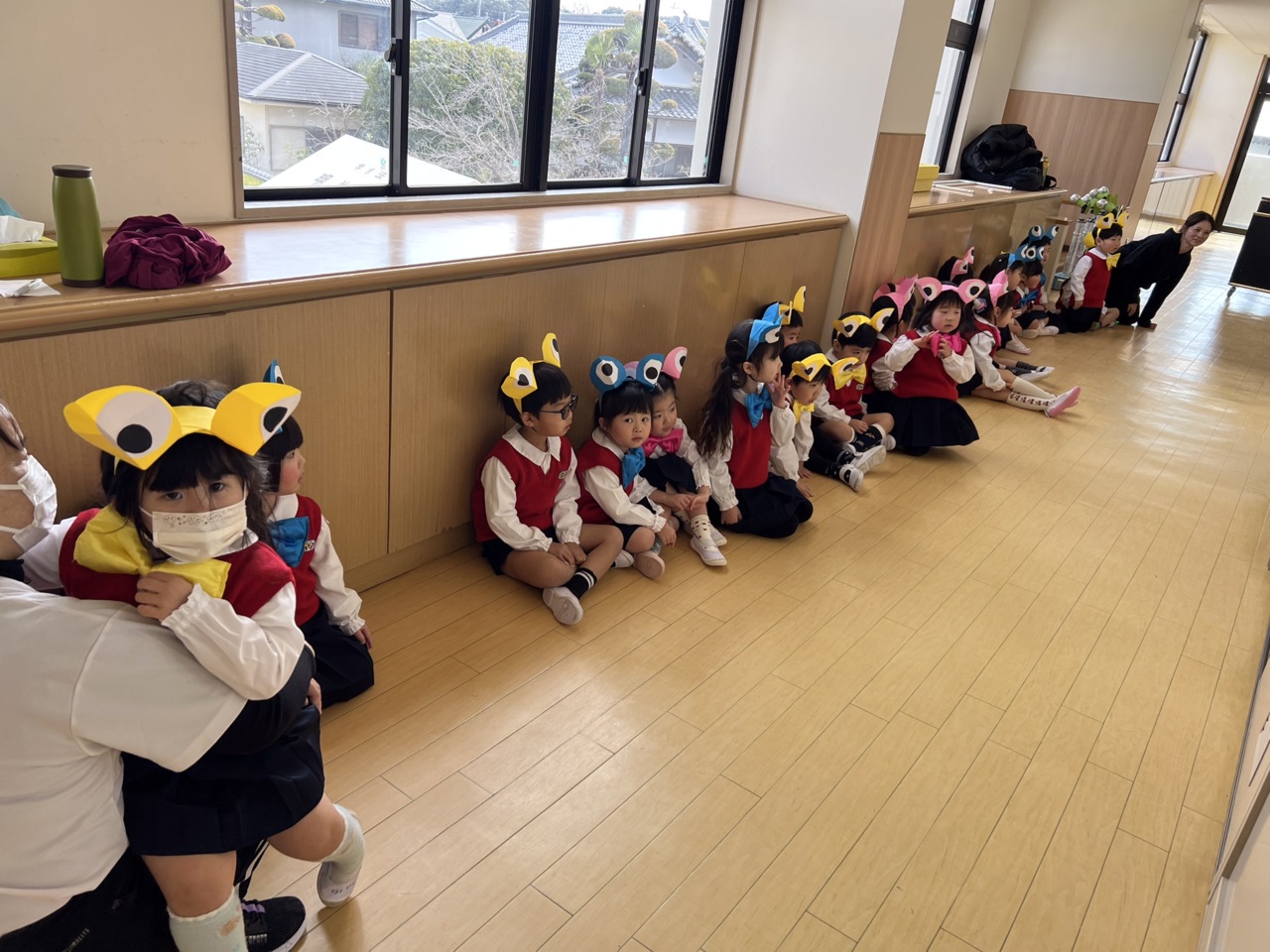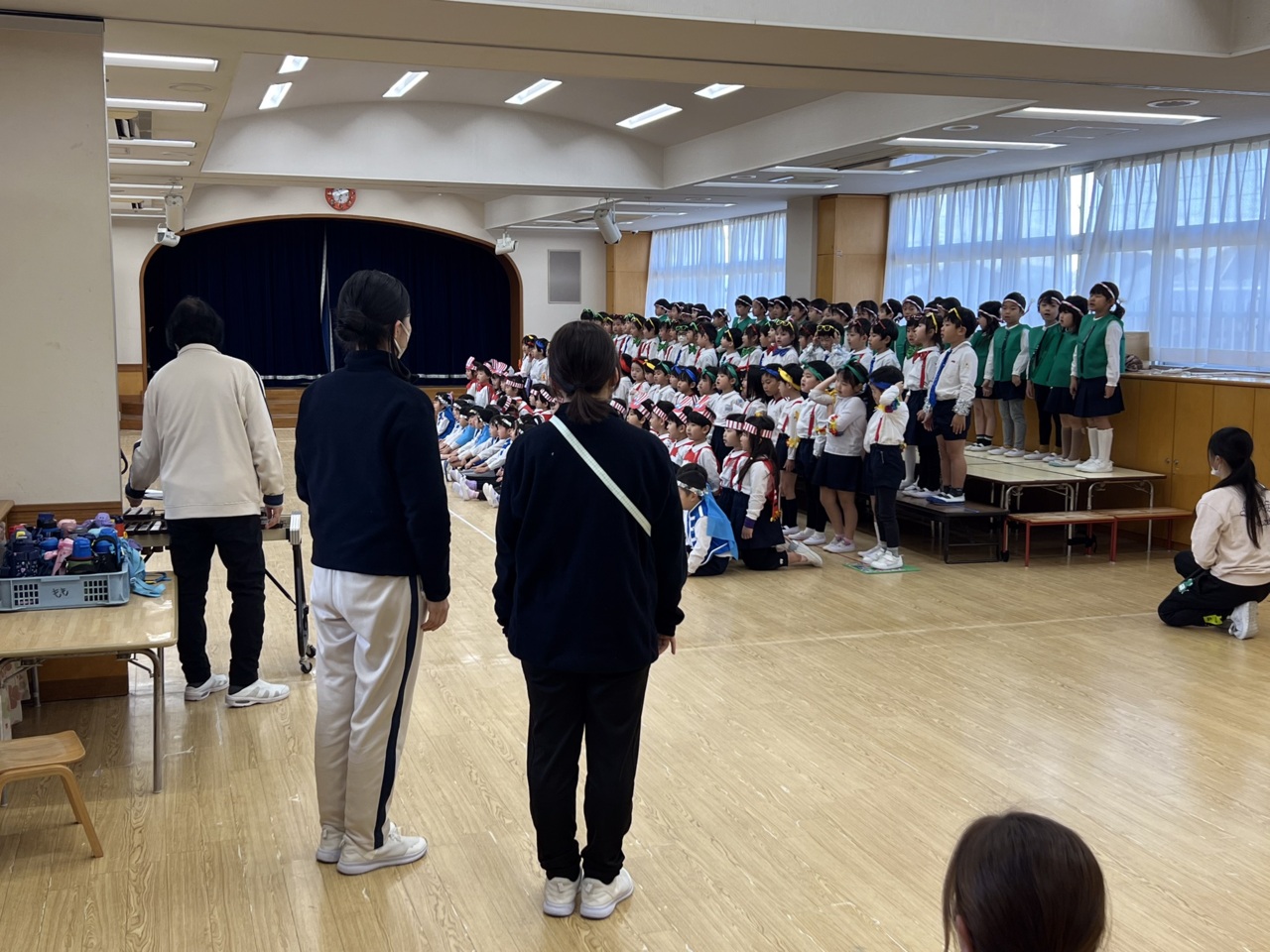 今日はお遊戯室で予行練習です。