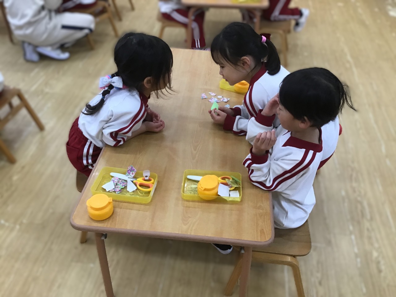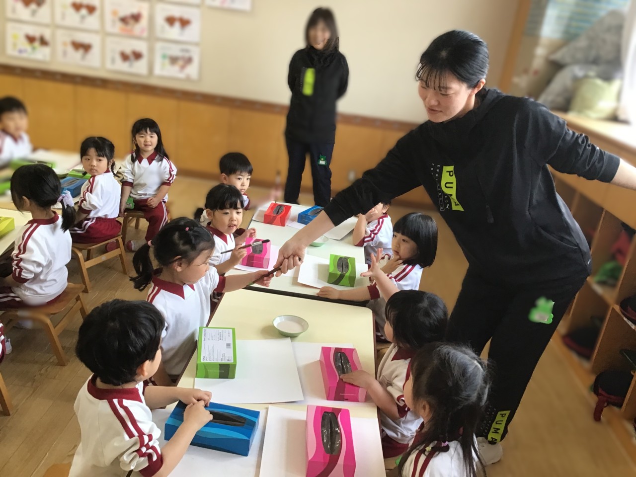 はいどうぞ。先生から魔法の杖をもらって糊付けをします。