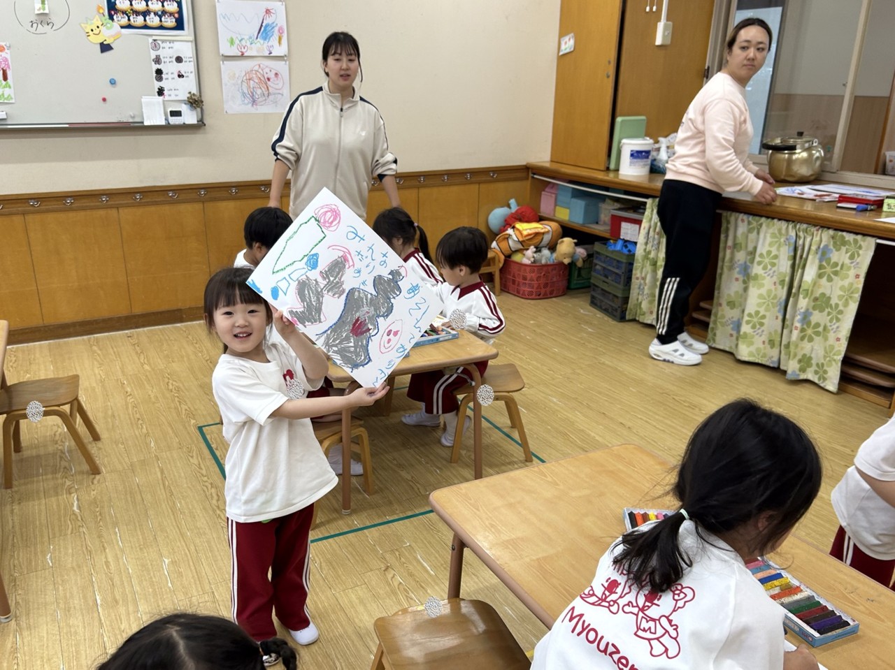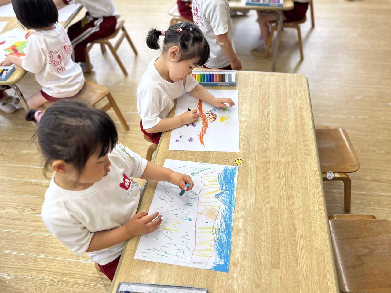 年中さんは、昨日の遠足の経験画に取り組みました!それぞれが思い思いに、楽しかった思い出を絵に表現してくれています(*^_^*)